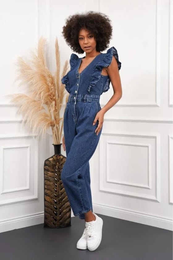 - Basic tasarımıyla her gardıropta kolayca yer bulan fırfır detaylı denim tulum, şıklığı ve rahatlığı bir arada sunar.