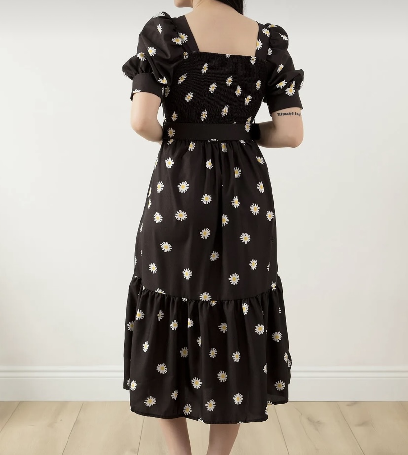Bu zarif siyah elbise, canlı papatya desenleriyle yaz mevsiminin enerjisini stilinize yansıtıyor. Göğüs kısmındaki büzgülü dokusu ve vücuda oturan kemerli tasarımı, feminen bir siluet sunarken aynı zamanda konforlu bir kullanım sağlar. Kısa balon kolları ve dökümlü etek kesimi ile hem gündüz hem de akşam kombinleriniz için ideal. Hafif kumaşı sayesinde sıcak günlerde ferahlık sunar. Dilersen spor ayakkabı ile gündelik, dilersen topuklu ile şık bir görünüm elde edebilirsin.